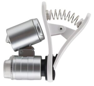 Powerful 40x lens. Unique, compact folding design with durable casing. Excellent illumination on specimen provided by two 6500º K LEDs. Can be used to identify plants and potential garden pests. On/off switch for the two LED lights. Batteries included.